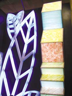 據展位負責人介紹,人造透光石具有無毒性、無放射性、阻燃性、不粘油、不滲污、抗菌防霉、耐磨、耐沖擊、易保養(yǎng)、拼接無縫、任意造型等優(yōu)點,兼?zhèn)浯罄硎⒂袷奶烊毁|感和堅固的質地,重量僅為天然石材1/4左右,且無毛細孔、色彩豐富、易打理、加工快捷,屬于綠色環(huán)保建材,并可根椐實際需求隨意彎曲。