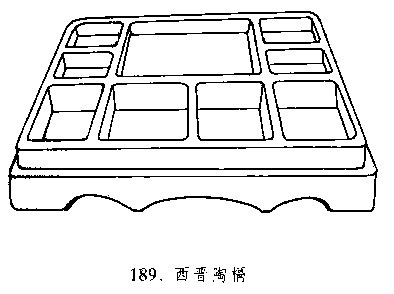 又稱“多子盒”、“果盒”、“格式盤”。江西南昌晉墓出土的長方形漆槅,底書“吳槅”,其形式與瓷槅相似,故定名為槅。瓷槅流行于三國及南北朝時期,且時代特征明顯。三國、西晉時器呈長方形,中分一大格八小格,初期是平底,稍后變?yōu)榉饺ψ悖惚谙虏壳懈畛龌ㄗ。東晉以后出現(xiàn)圓形槅,分為內(nèi)外圈、內(nèi)圈三格、外圈七格。南朝以后,圓形內(nèi)格數(shù)減少。(見圖189)