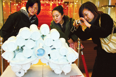 在展廳里走走看看,就像到了一個(gè)想象飛舞的創(chuàng)意世界。瞧,美國藝術(shù)家丹·貝爾把一堆杯狀廢棄物組合在一起,裝窯、澆釉、燒結(jié),最終變廢為寶,成了一件藝術(shù)精品,有了“只在此山中,云深不知處”的韻味。