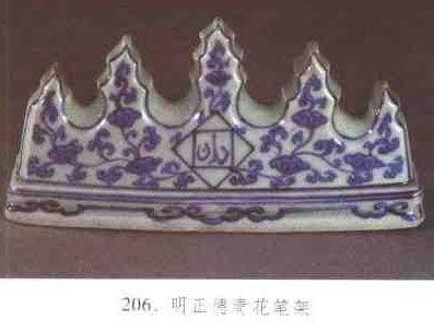 放置毛筆的文房用具,形如并列的山峰,故又稱筆山。元、明時期流行。北京元大都遺址出土的青白釉筆架,鏤雕成5座山峰形,山間浮云環(huán)繞,中間山峰上塑有朵云托日,山崖間布滿藤蔓,青竹挺拔.山間溪流中浪花飛舞,游龍嬉戲。1984年景德鎮(zhèn)御窯廠遺址出土了永樂釉里紅梅竹紋筆盒,也有筆架功能,器形為長圓形、平底、蓋與盒有子母口,盒內(nèi)分成三格。正德時期的五峰山式筆架,下連須彌臺座。繪纏枝靈芝紋,兩面有菱形開光,內(nèi)書波斯文“筆架”。萬歷朝筆架有長方形盒式。唇口沿外撇、四角內(nèi)折、長圓形足、內(nèi)有筆擱。有青花、五彩兩種。清代筆架形狀較為豐富,有盒式、山形和橢圓形數(shù)種。藝術(shù)水平超越前朝,如乾隆朝哥釉筆架。山峰做成玲瓏透雕狀,形似太湖石。(見圖206)