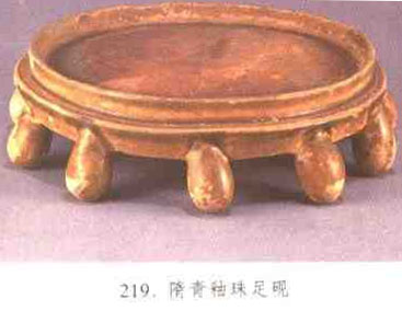 瓷硯的一種足形,作若干個(gè)長(zhǎng)圓的實(shí)心葡萄珠狀,均勻粘附在圓盤形硯池底邊。珠足從隋代起取代以前的蹄足,數(shù)目往往有8至10個(gè)或更多。足上均施釉。(見(jiàn)圖219)