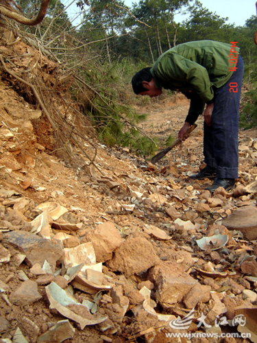 金溪縣北宋小陂窯是江西重要陶瓷產(chǎn)地,一度傳出“先有小陂窯,后有景德鎮(zhèn)”的民間說法,但是小陂窯的窯火僅僅燒了兩百年的時間,就戛然而止了,史料上也難尋蹤跡。2月的一天,祖祖輩輩在小陂窯遺址旁居住了數(shù)百年的村民說,貌不驚人的山巒深處經(jīng)常能流落出年代久遠(yuǎn)的瓷片,推土機(jī)偶然的一次開挖甚至讓大量的瓷片重見天日。值得我們期待的是,這些為揭開小陂窯的歷史面目提供了直接證據(jù)。