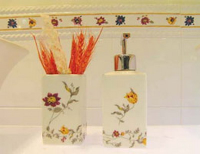 肥皂碟、牙刷杯等洗漱用品可以變成藝術(shù)品?你難以想象。然而,設(shè)計師就有足夠的想像力將它們演繹成陶瓷藝術(shù)品。肥皂碟呈現(xiàn)一個小小的扁圓形,有意思的是位于扁圓形中央的圖案設(shè)計———一張自然攤開的紅楓葉,看上去就像秋天楓樹上不經(jīng)意間落下的一片楓葉,悄悄地在一個陶瓷小碗上安了家。楓葉的紅,陶瓷制品的晶瑩剔透,兩者融合在一起,確實給予衛(wèi)生間一種別樣的美感。