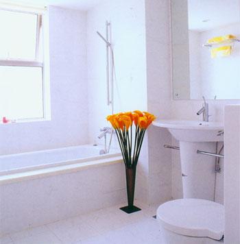 同樣為合理利用空間起見,浴室配置的選用,很考驗主人的智慧。鏡柜和底柜充實豐滿的浴室家具,可以將衛(wèi)生間中常用的洗面乳、牙刷杯、剃須刀等瑣碎之物都隱藏在鏡子的后面,同時也可以將其他使用周期稍長的洗滌清潔用品整齊地收藏在面盆下面的小柜中;占地小的分體座廁,既省地又省錢;長度在1.5米以下的浴缸,深度往往比一般的浴缸深,由于缸底的面積小,往往是更節(jié)約空間的選擇。此外如掛墻式淋浴龍頭、靠角臺面、單孔臉盆龍頭等,節(jié)省空間且現(xiàn)代味十足。
