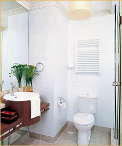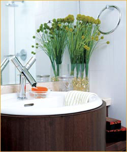 與淋浴間相對(duì)的墻面完全使用了鏡子,擴(kuò)大了小浴室的空間視覺感,鏡子前面做成了浴室架,上面安裝了臺(tái)式盆,這里可以梳洗打扮,邊上的綠色植物,成了整體設(shè)計(jì)中引人注目的亮點(diǎn),也為環(huán)境帶來了生氣。