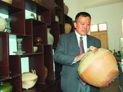 今年46歲的朱金林種過(guò)田,跑過(guò)運(yùn)輸,也開過(guò)飯店,13年前,他還在開車跑運(yùn)輸時(shí)就喜歡上了古陶瓷,每到一個(gè)地方,他總要抽時(shí)間到古玩市場(chǎng)去看一看,看到喜歡的陶瓷就買一些。為了增加專業(yè)知識(shí),他從《古陶瓷鑒定》、《唐五代瓷》等書籍中學(xué)習(xí),逐漸提高了自己的鑒別真假古陶瓷的能力,慢慢地也能揀到一些“漏”。為了讓妻子理解自己的愛好,他有意識(shí)地向妻子推薦中央電視臺(tái)的《鑒寶》欄目,如今妻子對(duì)丈夫的愛好也十分理解,昨天在陳列室對(duì)外開張時(shí),她里里外外忙個(gè)不停。