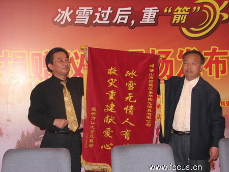 蒙萬明代表災(zāi)區(qū)人民向箭牌衛(wèi)浴贈送錦旗