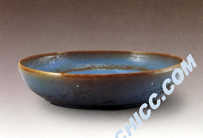 此盤斂口圓唇,斜壁淺腹,內(nèi)平底,矮圈足。通體施天藍釉,釉面光亮瑩潤,器表有冰裂紋開片?谘靥幨┯暂^薄,外壁釉厚處有流釉現(xiàn)象。圈足根露出赭2色胎,底部分佈有五個圓柱狀支燒痕。該器胎堅釉潤,形制古樸典雅。長葛石固窯藏共出鈞窯陶瓷六件,有碗、缽、盤各兩件。長葛地近禹州,這批窯藏應(yīng)系禹州鈞臺窯的作品。