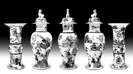 五件一套的大型組合陳設(shè)花瓶是專門為歐洲的宮廷豪宅設(shè)計的,從18世紀初起,就成為最時髦的西洋客廳擺設(shè),深受王公貴族的喜愛。此套組合陳設(shè)花瓶有史可考的前主人是美國羅得島上的名門凡阿倫家族,祖上曾當過南北戰(zhàn)爭時的將軍。19世紀中葉以后,凡阿倫家族在羅得島上的新港造了一幢英式豪宅,又從歐洲古堡里搬來大量古董,此套花瓶估計就是那時搬來的。