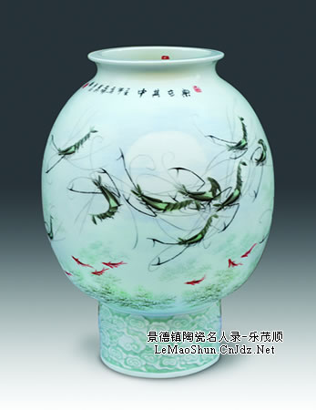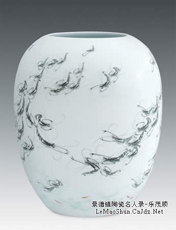 二十多年來,樂教授一直在鍥而不舍地努力追求著,他也取得了巨大的成功,他擅長(zhǎng)新彩、青花和綜合裝飾,他的陶瓷作品在景德鎮(zhèn)陶瓷界早已獨(dú)樹一幟,自成一家。2005年12月19日,在昌江大酒店十樓的大廳里,在首屆中國(guó)高級(jí)工藝美術(shù)師提名展筆會(huì)上,他的身邊圍滿了人群,大家目隨筆落,贊不絕口,記者們的閃光燈更是此起彼伏,不停地閃爍,他正在揮毫潑墨,他所畫的是一幅群蝦嬉戲圖,名曰《樂在其中》,果真是:獨(dú)樂樂,眾樂樂,樂在其中。