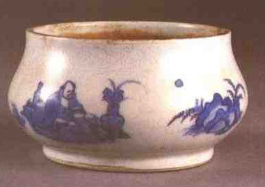 明代晚期天啟至祟禎年間(1621~1644年)景德鎮(zhèn)民窯生產(chǎn)的青花瓷器。萬歷四十八年(1620年)御窯廠停止生產(chǎn)以后,景德鎮(zhèn)民間瓷窯仍很活躍、晚明青花大多數(shù)是民窯即不署年款的瓷器,有少數(shù)作品如“天啟年制”款青花瓶等—類作品,可能是御窯廠的窯工還在繼續(xù)生產(chǎn),明朝社會動蕩不已,官窯署款,民窯不署款的慣例有些并不嚴(yán)格遵守。當(dāng)時社會各階層對青花瓷器的需求量較大,瓷器外銷也很活躍,官府限制松弛,從而使民間作坊得到發(fā)展生產(chǎn)的良機(jī)。晚明青花瓷器產(chǎn)量很大,青花鈷料有3個來源:衢州、信州的浙科、江西上高的邑青和豐城的粗料。器物大多是日用品,少數(shù)是陳設(shè)藝術(shù)品。裝飾花紋內(nèi)容很多,減少了官窯器純粹表達(dá)皇帝意志的規(guī)范圖案,出現(xiàn)了活潑的草蟲圖如蟋蟀、飛蝶,各類動物紋如牛、羊、虎、貓、魚、嚇、鸚鵡、鷺鷥等,還有人物戲曲故事、山水景物、庭園小景等。這些畫面多配以題畫詩,繪畫內(nèi)容、意境和筆法與當(dāng)時的文人水墨畫風(fēng)格一致,都著意表現(xiàn)士大夫階層在政治上失意、寄情山水田園的隱逸思想。由于廣泛采取分水和暈染技法,多有大寫意的情趣,面面開闊,筆意瀟灑酣暢,鈷料雖粗,著筆不多,但藝術(shù)效果不凡,有些繪畫筆法,如用青花點(diǎn)染太陽,具有明顯的時代特征。晚明青花藝術(shù)風(fēng)格的漸變,為清代青花瓷的勃興奠定了基礎(chǔ)。流傳到日本的“古染村”、“祥瑞”瓷,以及遠(yuǎn)銷歐亞各國的“芙蓉手”,很多都是晚明天啟、崇禎年間景德鎮(zhèn)生產(chǎn)的。(見下圖)