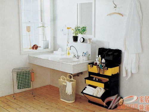 在盥洗臺旁補(bǔ)充一只晾物架和塑料收納柜非常必要。晾物架可用來晾掛毛巾,收納柜可以將在浴室中使用的洗漱用具、化妝品及毛巾收納其中。塑料柜很輕便,可根據(jù)需要移動,而且它的塑料材質(zhì)可防潮防水。