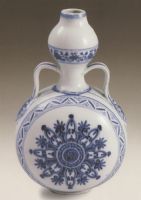 說 明: 此器系仿明宣德制品,無論在胎、釉、造型諸方面均仿造得極其成功,青花的仿制也十分出色,具有很高的亂真程度,但胎體稍輕,青花略顯漂浮.
