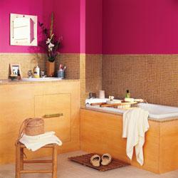 這個(gè)衛(wèi)浴間有著現(xiàn)代和傳統(tǒng)兩種元素的痕跡,浴缸和面盆都是十分普通的,所用的馬賽克和地磚種類(lèi)也都是物美價(jià)廉的裝修材料。但它們卻用了大膽的相互結(jié)合的手法,墻的上半部采用十分強(qiáng)烈的紅顏色,浴缸和面盆都用木貼面裝飾,并以馬賽克做鑲邊,飾品和輔助的家具運(yùn)用傳統(tǒng)的樣式和材料,一間特殊味道的衛(wèi)浴間就形成了。