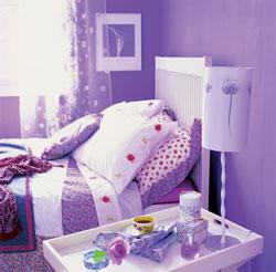 臥室里用了淡紫色的色調(diào),強(qiáng)化了浪漫的情致。臥室和客廳的家具用了統(tǒng)一的造型和色調(diào):白色的直線(xiàn)條的床,簡(jiǎn)單的白色床頭柜,還有纖細(xì)優(yōu)雅的臺(tái)燈。臥室的必備家具搭配有粉色和紅色花朵的軟性飾品:窗簾和靠枕、被罩。一間適合年輕夫婦的浪漫臥室就這樣布置出來(lái)了。