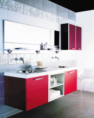 鮮亮的顏色永遠不會被設(shè)計師遺忘,在經(jīng)過一個沉沉冬季后,博洛尼已迫不及待地推出這款火紅的衛(wèi)浴主題墻,夏日的熱力激情勢不可擋,尤其能凸現(xiàn)摩登女郎們的驚艷魅力。2007年的亮色主題較往年更大膽,通體的紅色烤漆浴室家具加上銀色不銹鋼入墻龍頭,以及如蕾絲般的Art Deco風(fēng)格瓷磚裝飾,就這樣整體造型吧,即便是十分自我的衛(wèi)浴空間,也要Show出最響亮的時尚宣言。