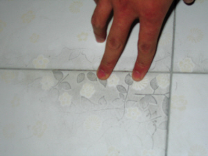 據(jù)何鐵柱敘述,裝修的時(shí)候,為避免地磚被硬物劃傷,他曾用廢紙箱蓋在地磚上,勾地磚縫時(shí),便發(fā)現(xiàn)有些地磚花了,就像被磨漏后沾了臟東西。因?yàn)檫沒(méi)有裝門、吊頂、櫥柜及燈具,所以他又用廢紙箱將地磚保護(hù)起來(lái)?傻鹊降蹴斞b完后,他發(fā)現(xiàn)花的地磚更多了,也花得更厲害了。