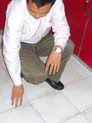 起初,何鐵柱以為是自己一次無(wú)意且錯(cuò)誤的清潔造成的。“那天工人在清潔廚房地磚縫,我想磚縫挺黑的,就想拿鋼絲球擦一擦,剛擦了一小會(huì)兒,工人馬上制止了,說(shuō)鋼絲球會(huì)破壞瓷磚釉面,我一看,果然剛擦的地方就花了,黑黑的。”但那次只擦了10厘米左右,此后何鐵柱也不敢再用鋼絲球清潔地面,但瓷磚變臟、發(fā)花的情況卻越來(lái)越嚴(yán)重,于是他推翻了自己最初的想法。