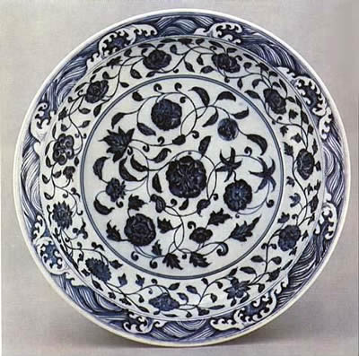 明代永樂年間,鄭和七次下西洋從伊斯蘭地區(qū)帶回一批“蘇尼勃青”料,這種青料含有高鐵低錳,在適當?shù)幕鸷驘煜鲁尸F(xiàn)出藍寶石般的鮮艷色澤來,同時又因含鐵高,在燒制過程中在青花上會出現(xiàn)黑斑點,平添了幾分自然美,這也是永樂青花瓷器的一大特色。