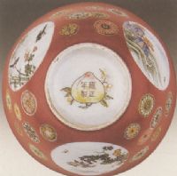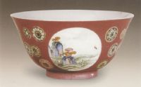 說 明: 此碗三面開光內(nèi)分繪竹梅雙喜圖、萬代長春圖、壽山福海圖。