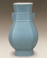 說 明: 此瓶仿制西周時青銅壺的造型,于樸拙大方中見雋秀雅典,既有古韻又因其釉色而平添了新姿,堪稱難得.