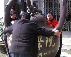 程苗根用了2噸濕泥原料,花了10個(gè)月才做完。當(dāng)時(shí),像造房子一樣搭了腳手架,一點(diǎn)點(diǎn)做起來。好不容易做好之后,移位也是件非常麻煩的事,特地買了液壓鏟車,借了36立方米的大窯,可是紫砂壺卻放不進(jìn)去,后來只好把窯口給敲了,搬進(jìn)去燒了二十多個(gè)小時(shí)。