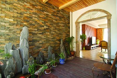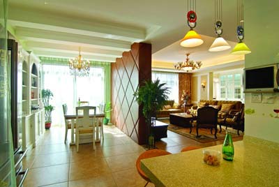 客廳的主題墻為真皮飾面,真皮飾面的沉實色調(diào),透過客廳、餐廳的兩盞水晶吊燈變得柔和瑰麗,呈現(xiàn)出莊嚴的大宅風貌;淺色的仿古磚地面,再配襯以精心挑選的布藝家私,頓時讓略顯古板的空間平添生機;客廳、餐廳的隔而不斷,相互呼應,營造出交錯變化的空間感。同時大氣的棕黃色與明快的亮白色形成鮮亮的對比,使業(yè)主能瞬間體會移步換景的感覺。