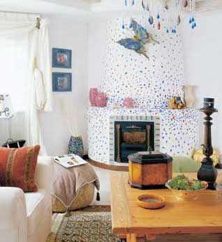 簡潔流暢的壁爐設(shè)計是典型的愛琴海風(fēng)格,手工涂抹的壁爐結(jié)構(gòu)是用白水泥做底,將彩色瓷碗敲破后,一塊塊粘貼上去的。而那看似隨意垂掛、實為用心設(shè)計的窗幔又為這一閑適情調(diào)的客廳增添了一抹慵懶。