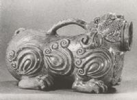 說 明: 胎淺灰色,茶綠色釉,施釉勻凈.整個(gè)器體造型生動(dòng).
