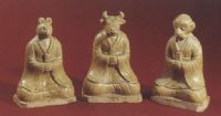 說 明: 三俑著衣,持笏,盤坐,形象逼真,釉色青黃.十二相屬之說始于東漢,而十二生肖俑則創(chuàng)于隋,并常用以記時.