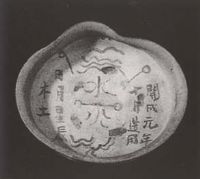 說(shuō) 明: 胎色紫紅,釉色灰青,外壁釉不到底.碗中的文字和圖像當(dāng)為道家所作.