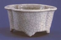 說 明: 通體滿青灰色釉,釉面開細碎紋片.底下承四如意頭式足.造型精美,是傳世中的罕見之物.