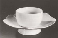 說 明: 胎薄,質(zhì)細(xì)白,釉面晶瑩勻凈,微泛黃,芒口毛足.采用釉接法,底書一行書"官"字.造型秀麗.