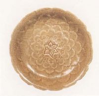 說 明: 胎灰白細(xì)潔,釉色青中泛黃,有細(xì)冰裂紋,足底無釉,矮圈足.盤內(nèi)刻有"做出芙蓉樣青器,賣買客人皆富貴"七言詩二句,反映了窯主人的愿望.