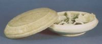 說 明: 施青釉.蓋上飾有纏枝牡丹和卷草圖案;盒內的堆塑組成一幅繁而不亂,清爽美麗的圖案.