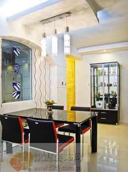 這是套兩室一廳的房子沒有餐廳的位子,但經(jīng)過設(shè)計(jì)師的巧妙設(shè)計(jì)餐廳也有了它自己的位子。餐廳以吊頂來與客廳進(jìn)行區(qū)域劃分,從空間看既是客廳的一部分又是個(gè)獨(dú)立的空間,這真是個(gè)用心的設(shè)計(jì)。餐廳的背景墻采用部分彩繪的透明玻璃做背景,在背景墻的整體設(shè)計(jì)上以拉伸型的壁紙來拉伸視覺空間,半弧型的造型上還安裝了兩個(gè)射燈來打出彩繪玻璃的色彩感。這個(gè)透明的彩繪玻璃既產(chǎn)生了視覺美又體現(xiàn)了功能互補(bǔ)上,在廚房可以看見客廳里的一切,在客廳也能看到廚房,在燈光上也起到互補(bǔ),既美觀又實(shí)在。
