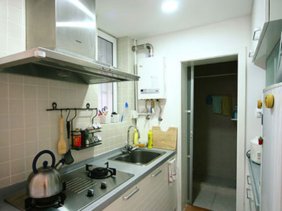 廚房的一邊,有燃?xì)庠、脫排、水槽、熱水器等日常用品,還有一扇窗哦,空間小做飯的時(shí)候可以通通風(fēng),這樣煙就不會(huì)在室內(nèi)竄了。大家看到衛(wèi)生間了嗎?由于衛(wèi)生間比較小所以采用了移門真是空間節(jié)約不少啊!
