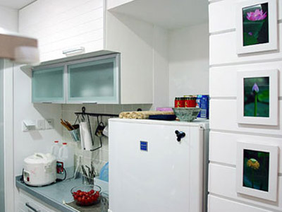廚房的另一邊就顯然比較功能化,冰箱、微波爐(冰箱上面那塊空間)、儲(chǔ)藏柜一個(gè)不能少,再在裝飾墻上掛幾幅小的畫,整體感覺(jué)既功能化又美觀。