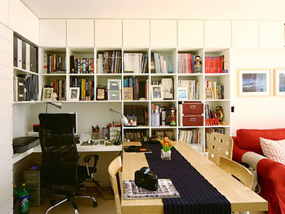 老公房空間小,是眾所周知的。但現(xiàn)在生活書房、餐廳、客廳是必須具有的三個(gè)生活空間。空間小的話那么可以試著像這樣把三個(gè)空間合并在一起,視覺效果也是不錯(cuò)的。但具體情況還是要看業(yè)主的生活方式,本案例中的業(yè)主兩人都是建筑師工作時(shí)需要較大的工作臺(tái)畫圖紙的時(shí)候感覺舒服,這個(gè)時(shí)候餐廳就可以變成工作室,餐桌就成了寫字臺(tái)。