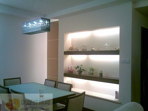 在餐廳的設(shè)計(jì)上,設(shè)計(jì)師破了餐廳墻面,對(duì)墻面進(jìn)行鏤空來創(chuàng)造出一個(gè)展示空間,同樣是淡色的內(nèi)墻,咖啡深色的擱板,顯得一切既有條理又有立體風(fēng)尚。