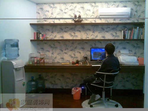 書房的設計也同樣采取和餐廳展示同樣的概念,書桌做成擱架的款式,占據(jù)了整個墻面,既可以進行電腦辦公,也可以用來進行寫字作業(yè),而上方的兩個擱板,擁有展示和存貯的雙重功用。家庭墻面可謂用至利盡。