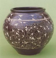 說 明: 在剔出的米黃色的胎地上烘托黑褐色釉的花紋,色調(diào)和諧,紋飾粗放,是雁北地區(qū)剔花裝飾的代表作品.