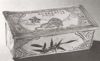 說 明: 白釉地繪黑褐色彩.題行書"明道元年巧月造,青山道人醉筆于沙陽".底部有"張家造"戳記.器形質(zhì)樸大方,紋飾簡潔明快,是國內(nèi)僅存的一件磁州窯書紀(jì)年款枕.