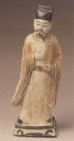 說 明: 胎體粗松,火候較低,色潔白.全身施白釉.各種色彩均系釉上所繪,需兩次入窯低溫烘就,故易脫落.宋代彩塑人像,在山東,河南等地的窯址及墓葬內(nèi)常見,是宋代彩瓷中的新品種.