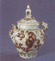 說 明: 胎質(zhì)細膩,青白釉.堆塑飾以釉里紅點綴,造型生動,形象逼真.全器造型奇特,工藝精巧.