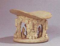 說 明: 胎骨呈灰白色.釉面勻凈,白中閃青綠色,有細小開片.枕為雕塑的亭臺造型.