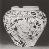 說 明: 白釉黑彩.花朵和嬰兒兩相襯映,生動活潑.
