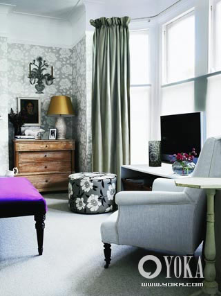 古典風(fēng)格的沙發(fā),一般體積偏大,家里來了客人,需要臨時(shí)調(diào)換沙發(fā)的位置來騰出更多的空間,帶輪的沙發(fā)和扶手椅就很方便。圓形的小腳凳充當(dāng)臨時(shí)座位,以免怠慢了客人。家里的小孩最喜歡低矮柔軟的小腳凳,他們能夠毫不費(fèi)力地爬上爬下,腳凳的高度也適合他們觀看電視。擺在沙發(fā)旁邊和電視柜下面的收納筐可以隨手放雜志報(bào)紙和DVD,方便實(shí)用。