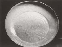 說 明: 盤心印獨(dú)龍戲珠紋,內(nèi)壁印陽文纏枝蓮花,上托八寶,紋間印有對(duì)稱的"太禧"兩字.因而此盤屬祭器.