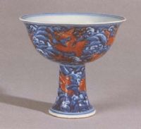 說 明: 此杯在釉下以青花海水作為地色,釉上用礬紅料染繪海獸,波濤洶涌,怪獸奔馳,構(gòu)圖十分新穎.是宣德青花加彩器中的杰作.